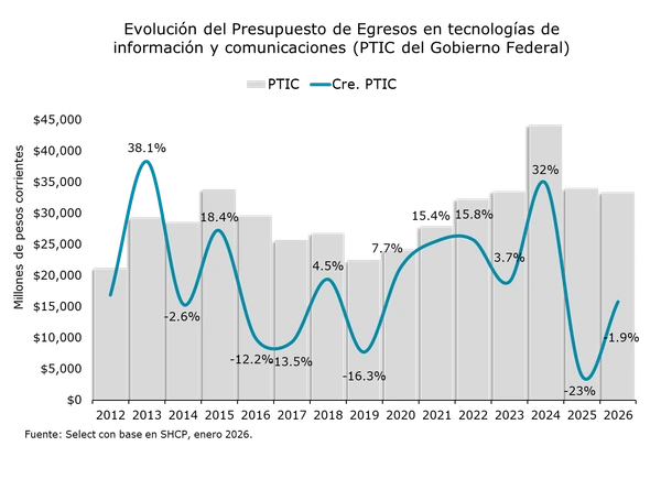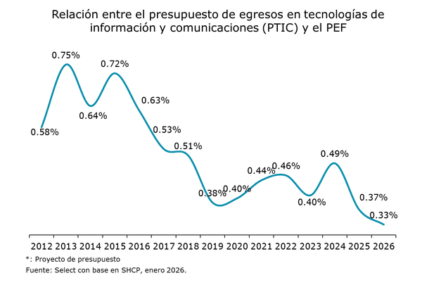 De acuerdo con el análisis elaborado por Arely Reyes Gaspar de la consultora Select, el PTIC aprobado para 2026 asciende a 33,395 millones de pesos, cifra que representa una reducción de 1.9% frente a 2025 y un ajuste adicional respecto a lo proyectado meses atrás. Con ello, la relación entre el presupuesto TIC y el Presupuesto de Egresos de la Federación (PEF) alcanza su nivel más bajo desde que se tiene registro.