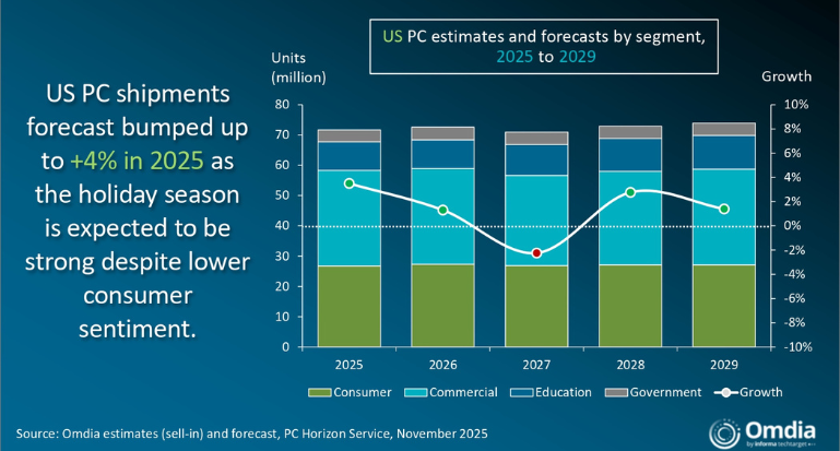 Aun así, la industria estadounidense no está en crisis: todo apunta a que cerrará 2025 con un crecimiento del 4%, impulsada por la temporada navideña y la migración masiva hacia Windows 11.